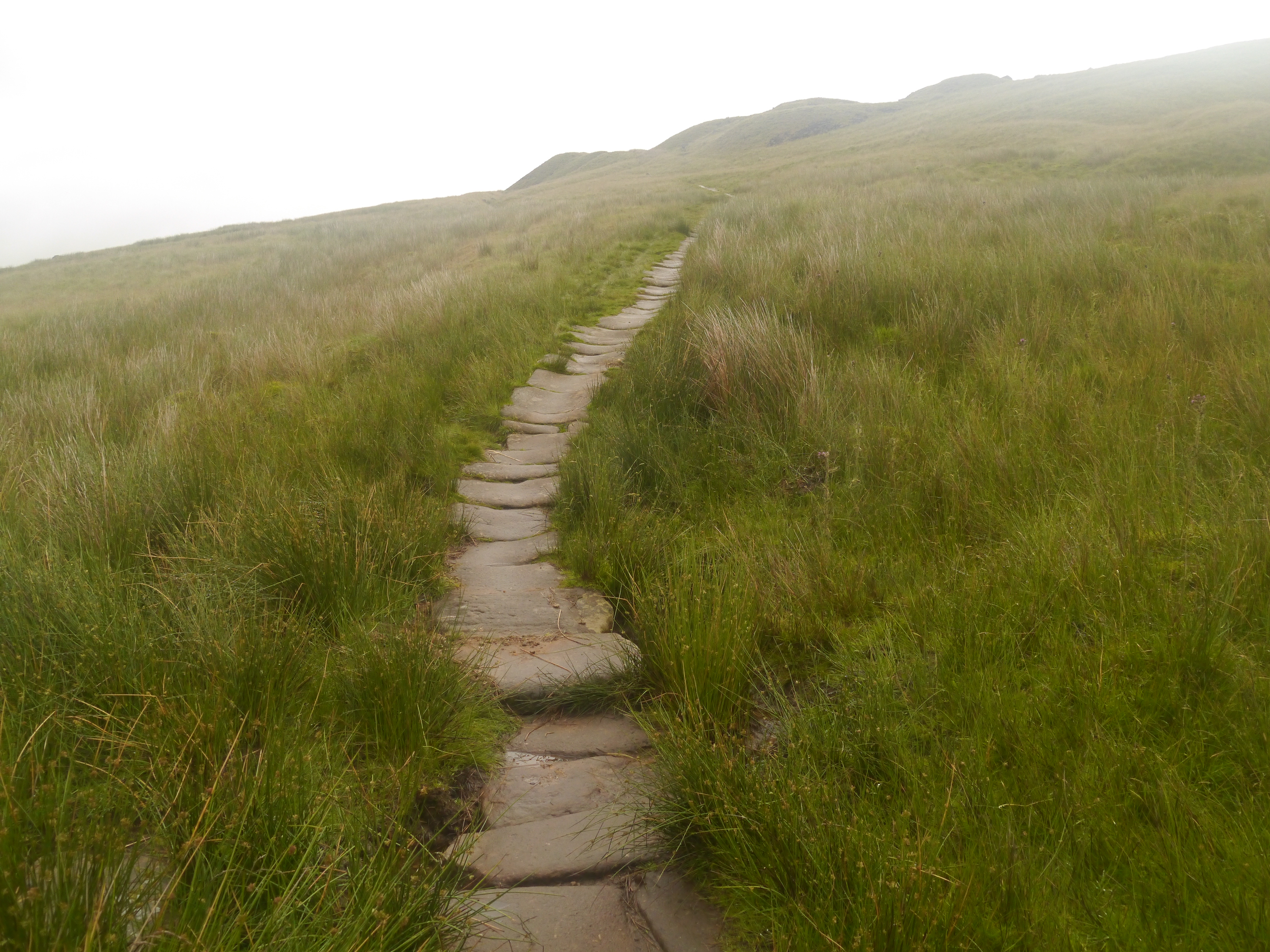 his knee the only step, too exhausting, through the reservoir, up, up, up, only a second, to say good bye, see you in London, charge on, the path is clear, no shortcuts, as fast, as possible, time the miles, doing well, another reservoir, Pennine way again, a man, with a tripod, talks about the weather, sorry, no time, cross road, flagstones, endless flagstones, need to take a picture, they are so amazing (regret that later, as this was the missing minute for the train), down, down, don’t slip, another man, sorry no time, down, down, reach Marsden, see the Standedge tunnel, why I wanted to go to Marsden (never told Anthony), 2+k from here, never realized, walk, as fast, fast as I can, no drink, since Whitestone, in those boots, no running, too heavy, another man, says it’s a mile, 8 min, too far, the train station, I see the train, heading to the famous tunnel…